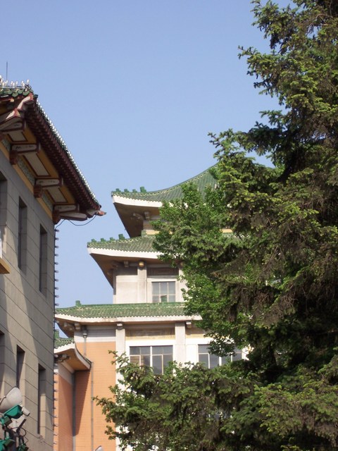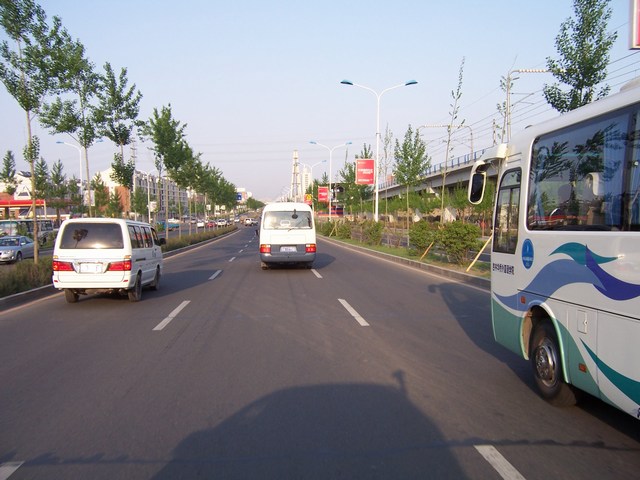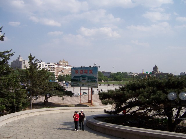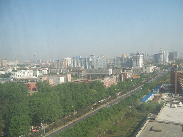 Blick aus dem Hotel Red Buds entlang derRemnin Street (Volksstraße) vormals Stalin Street.Links im Hintergrund der Fernsehturm "Jilin Tower"